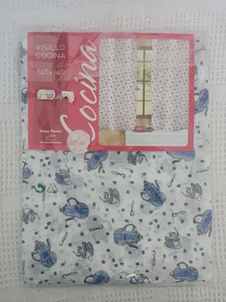 Cortina para cocina con un bonito diseño. Era de una ventana de 90. Mide 180 de ancho. - Encaje blanco decorativo en la parte superior e inferior. - Estampado de frutas, tarros y botellas en la parte central.