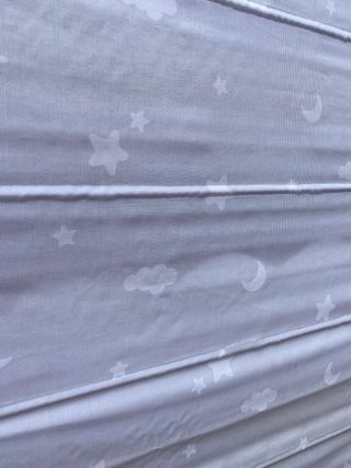 Cortina con motivo de lunas estrellas y nubes en azul clarito. Ancho 1m x 2m alto aprox El mecanismo necesita repararse