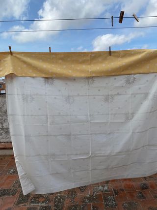 Conjunto cortinas a medida, en color blanco con estampado bordado de soles y estrellas preciosas. Viene con el cubre mecanismos en amarillo. Tiene todas las varillas. Cortina grande Ancho 180 Alto 153 Cortina pequeña Ancho 58 Alto 153
