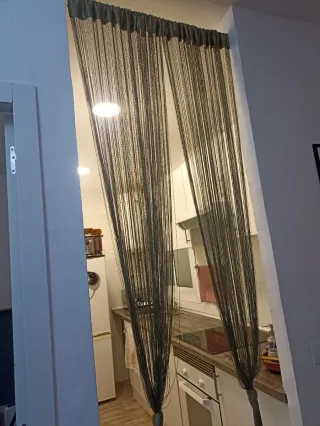 Par de cortinas de hilo para cocina en tono verde oliva. Son ideales para separar ambientes o como elemento decorativo. - Diseño de hilos finos. - Acabado texturizado en la parte superior. La barra extensible está incluída.