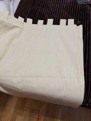 Cortina con un diseño de rayas finas en blanco y amarillo, ideal para dar un toque de color a cualquier habitación. - Confeccionada en tela. - Diseño de rayas verticales.