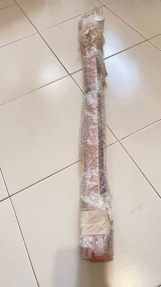 Barra ducha extensible, máximo 135cm. Comprada en Leroy Merlín. Una semana de uso hasta instalación de mampara. Cortina básica con anillas