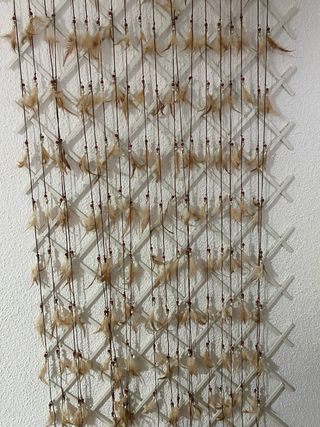 Cortina beige y blanca con diseño