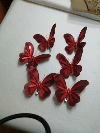 Color rojo fuerte y brillo tela y plástico y con pinza para enganchar Quedan preciosas