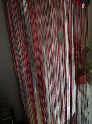 Doble cortina de hilo, color negro y rojo, cosidas. Para separar ambientes, para fondo, para decorar, etc. Vendo por cambio de idea en proyecto decorativo.