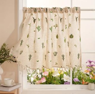 Cortina beige con motivo de cactus (foto 1), es bordado, no impreso. Ideal para dar un toque fresco y natural a tu hogar. - Confeccionada en algodón y lino con diferentes tipos de cactus bordados (no impresos) - Perfecta para dar un toque rustico a muebles de baño o cocina. - Instalación de cortinas tipo francesa para dar privacidad sin quitar luz en baños, cocina, salón.. Dimensiones 100 x 60 cm. Varillas telescopicas para instalar fácilmente también disponibles.