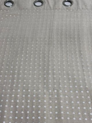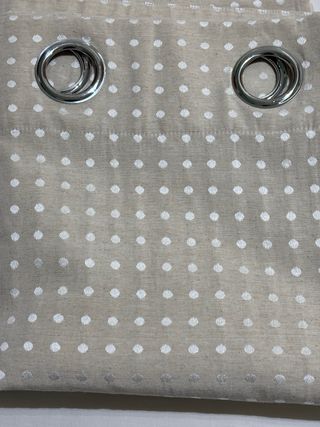 Precioso par de cortinas de lino. Son de color beige con lunares blancos, un diseño elegante y discreto. - Ideales para dar un toque de estilo a cualquier habitación. - Confeccionadas con un tejido de lino de gran calidad. - Tienen ojales para colgar fácilmente. -Medidas (en cm): 128 (ancho) cada cortina x 240 (largo).