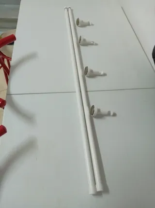 -2 barras extensibles de cortina de 2 cm de diametro,de metal color blanco mate con tapas del mismo acabado. -4 soportes abiertos de 95mm de largo ,metal color blanco mate. Nuevo. Jamás ha sido usado. De Leroy Merlin. Costó 69€