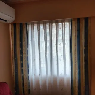 CORTINA con tela que repele el polvo. Medida 268 x 210 cm GOTERA 276 × 41 cm. Incluyo los ganchos metálicos. La orilla hecha. ALZAPAÑOS. Poco uso por vivienda montaña * Vendo también colcha a juego, para cama de 90 cm.