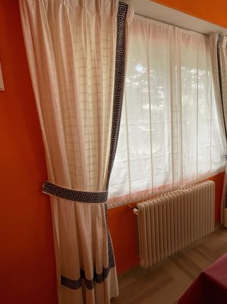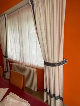 Elegantes cortinas para comedor con un distintivo diseño. - Borde con patrón griego. - Acabado en tela de calidad. Las vendo porque quiero hacer reforma en el comedor. Las cortinas están impecables ya que las hemos cuidado mucho. Vendo también los estores junto con todo el material para colgarlas y los ganchos para sujetarlas en un lateral Los estores miden 110cm x 150cm largo. Tengo otras cortinas y estores iguales de otra ventana por si estás interesad@
