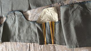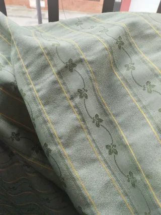 Retal grande de tela de alta calidad, ideal para cortinas. -Medidas 6 metros por 2,60 - Diseño a rayas verticales. - Textura sutil con pequeños motivos florales. - Acabado satinado.