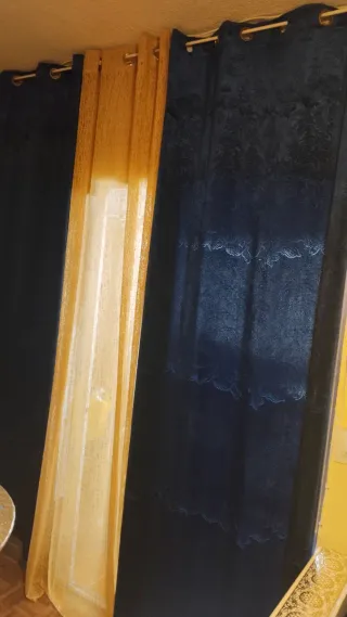 Lote de cortinas nuevas, listas para instalar. - Incluye todos los accesorios necesarios para su montaje. - Tejido con detalles decorativos. - Accesorios de madera. En el precio incluye:2 cortinas, barra de madera mide 1,55cm, 2 soportes, 2 embellecedores para el final de la barra de madera,arandelas de madera con su enganche de metal para enganchar a la cortina,que también tiene sus enganches metálicos, listas para colgar, hechas a medida, cambio de idea por decoración, por eso vendo, lavan en lavadora y no se arruga nada. Miden 164 cm de ancho cada una,son 2 cortinas,altura 109 cm, bajo hecho de 8,5 cm que lo puedes bajar si lo d