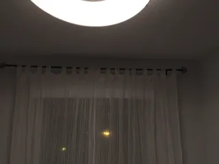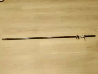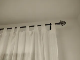 Barra extensible (87 - 150 cm) a presión para cortinas o visillos, en metal de color negro. Diámetro del tubo 1,8 cm (diámetro del terminal 3 cm), comprada en Leroy Merlin. Se nota el uso en algunos pequeños desconchones del metal y en los plásticos que van en los terminales (y que luego irán pegados a la pared), pero puesta no se nota nada (se intenta mostrar en las 2 últimas fotos). #metalico