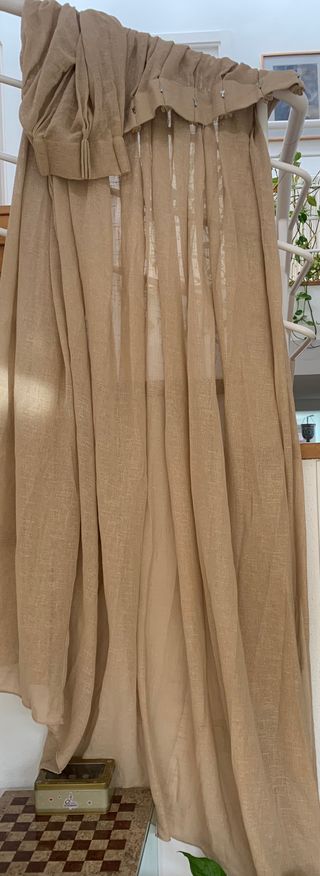 Cortinas de tela en color beige. Son ligeras y dejan pasar la luz. Hay 4 y se venden por separado - Diseño con fruncido superior. - Cuelgan con ganchos.
