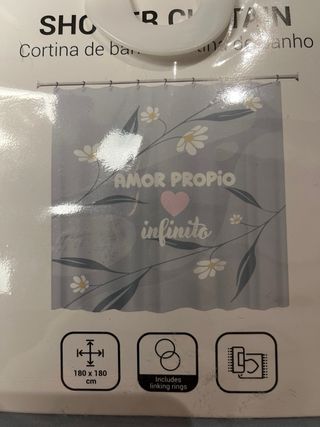 Cortina de baño con diseño floral y texto Amor Propio Infinito. - Medidas: 180 x 180 cm. - Incluye ganchos para colgar.
