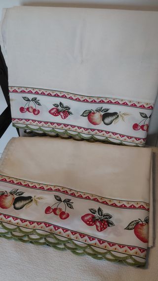 Juego de cortinas para cocina con un alegre estampado de frutas. Hay para ventana corta y ventana larga. precio por todo - Diseño con manzanas, peras, fresas y cerezas. - Borde inferior con volantes decorativos. color vainilla - Medidas: 155 x 85 cm ; 140 cm ancho x 165 cm largo (cada cortina). - confeccionada con costura para colgar con cinta o barra.