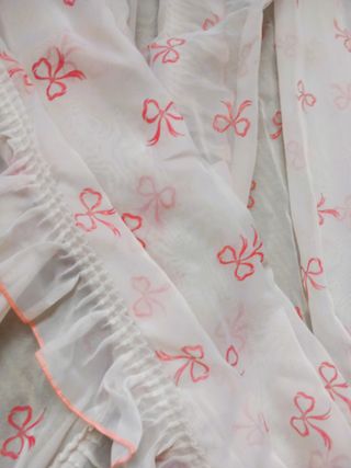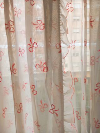 Cortinas cruzadas romanticas, en gasa blanca, de tres paños (son más elegantes) con bordados y remates en rosa. Se pueden recoger de modo sencillo por la mitad hacia cada lado, o se pueden recoger de modo triple (quedan más cruzadas, y más bonitas). Fueron confeccionadas por Oriente Decoracion (Lugo). Tambien tengo la barra en mi perfil. Las medidas están en el dibujo que adjunto. La barra no está incluida en el precio.