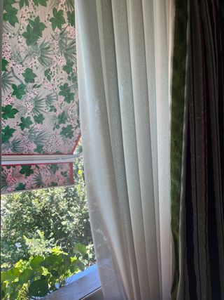 Preciosa pareja de cortinas. Una de lino color beige y otra con estampado de ramas en tonos verdes y beige. Ideales para dar un toque elegante y natural a cualquier habitación. - Están confeccionadas con materiales de alta calidad. - Son de caída fluida y elegante. - Perfectas para salón o dormitorio.