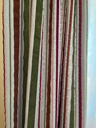 Cortina de tela en tono burdeos con finas rayas verticales. A lo mejor el color no es exacto por las sombras. Está lavada y planchada pero lleva bastante tiempo guardada así que recomiendo volver a lavar. - Medidas: 2 metros de ancho por 2.30 metros de alto. - Diseño con trabillas para colgar.