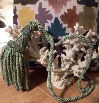 Abrazadera de cortina antigua, comprada en la tienda “Galón” hace muchos años. Color verde empolvado y mide 70 cm de largo.