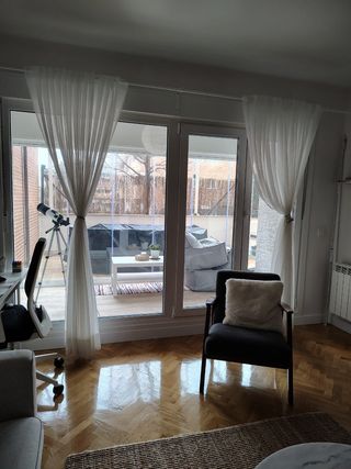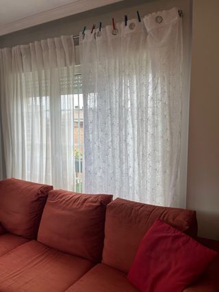 2 cortinas para salón. Blancas. Compradas en Leroy Merlín. Opacidad baja, cuasi translúcidas. Con guarda/ doblez sobre el final de cada paño. Medidas de cada una: 228 cms largo/alto x 300 cms ancho. Sistema de fruncido para barra. Aptas para riel.