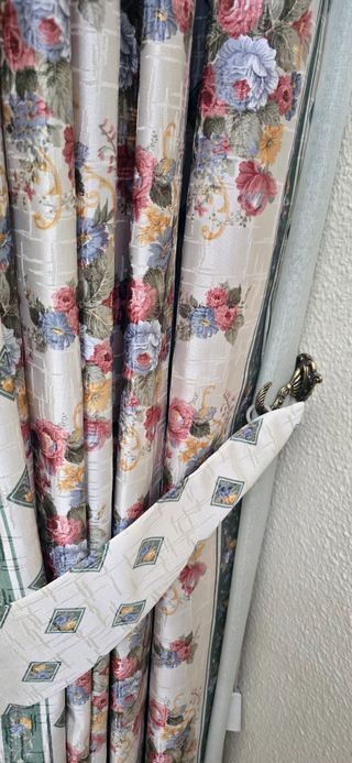ÚLTIMO PRECIO A la venta hasta mediados de enero. Juego de cortinas caídas con bando y atrapapaños. Recogida en mano en zona Diego de León, Madrid. - Medidas: 150x270 cm. - Diseño floral y de rombos.