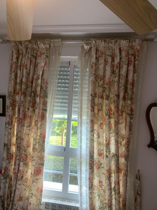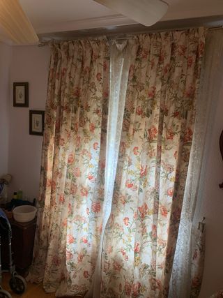 Son dos cortinas, elaboradas por encargo y de calidad, de 150 alto x 158 cm. cada cortina. El tejido de algodón, color blanco con flores verdes. Dobladillo inferior 32 cm. con posibilidad de alargar la cortina. Se regalan todos los ganchos para colgarla. Ideal para sala o dos habitaciones.