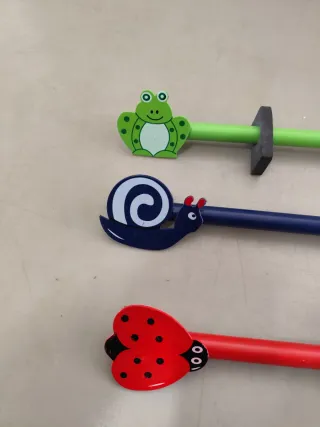barra para cortinas infantiles con divertidos diseños de animales. - Barra verde con diseño de rana. - Barra azul con diseño de caracol. - Barra roja con diseño de mariquita. - Incluye soportes de pared con tacos y tornillos. Medidas de largo extensible desde 110 cm a 210 cm Precio unidad