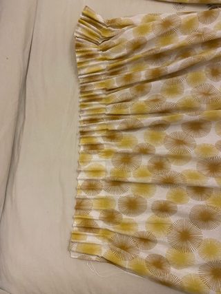 Cortina con un bonito estampado de círculos en tonos amarillos y blancos. Ideal para dar un toque de color a cualquier estancia. Tamaño de 1,5 x 1,55 cada hoja para ventana de 1,30 - Diseño con motivos de explosiones solares. - Acabado fruncido en uno de los laterales.