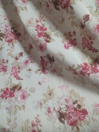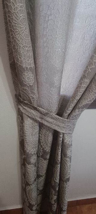Preciosa cortina de tela, color beige claro. Ideal para dar un toque elegante y delicado a cualquier espacio. - Estampado floral - Diseño sencillo y atemporal. La vendo junto con colcha a juego para cama de matrimonio de 1,50. TAmbien se venden por separado 23€ cada uno Medidas cortina: ancho 1,95 largo 2,56 largo parte del rizo 1,05