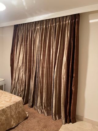 Cortina dorada brillo para colgar sobre barra. Lleva una unión en el centro, véase fotos. Bajo con dobladillo, laterales acabado negro de la misma tela cortada. Medidas aproximadas 300 cm ancho y 240 cm altura. En buen estado. Se ve muy lujosa, pero se aprecia costura en la unión