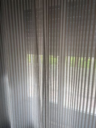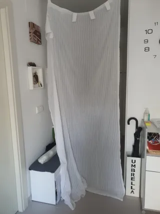 Cortina de tela, con carril, mide 1,45 de largo y 111cm de ancho, aunq el ancho se puede dejar a la medida q quieras recortando el carril, siempre a menos medida claro. diseño elegante y sutil. - Diseño de rayas verticales finas . - Tejido ligero y translúcido.