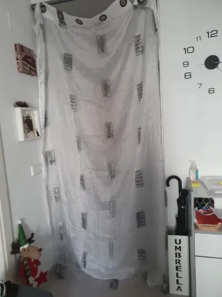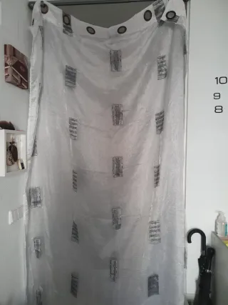 Cortinas elegantes con un diseño moderno. - Tejido ligero y translúcido. - Detalles plateados rectangulares. - Ojales metálicos para colgar. -Tienen doble capa como se aprecia en la foto . -Muy bonitas y en perfecto estado. - Son dos hojas para que pongas una a cada lado por 4€ cada una. - Te regalo la tercera que esta usada, con el bajo cogido pero podrás utilizar para hacer abrazaderas, lazos, cortinilla ect