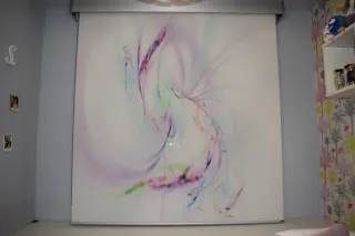 Stor para habitación con un diseño abstracto y moderno. Añade un toque artístico a tu espacio. - Diseño en tonos morados y blancos. - Confeccionada en tela. - Galeria de aluminio mate