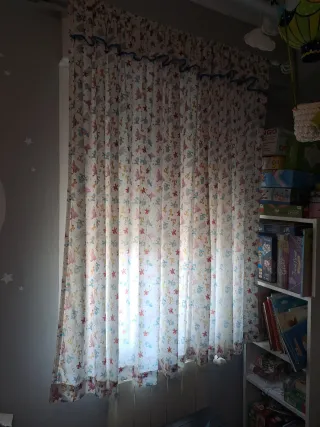 Cortinas de tela con un diseño delicado y elegante. - Patrón de encaje con motivos florales. - Textura ligera que permite el paso de la luz. - Son dos cortinas de 2,30x 2,30 cada una