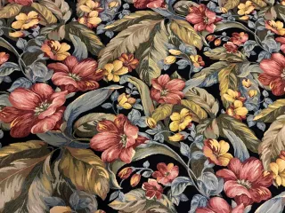 Tela con un vibrante diseño floral sobre fondo negro. Ideal para dar vida a tus proyectos de decoración. - Medidas: 3,50m. de longitud × 1,40m. de ancho. * Las fotos 4 y 5, muestran la tela del revés. - Estampado de flores y hojas en tonos rojos, amarillos y azules. - Textura rica y detallada.
