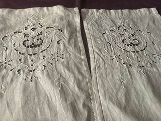 Cortinas antiguas de lino con un diseño delicado. - Medidas: 70 cm de ancho x 37 cm de alto 9 cada una - Detalle de bordado calado. - Acabado con puntilla.