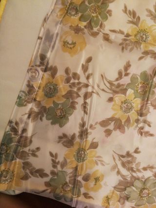 Cortina con un bonito estampado floral, ideal para dar un toque de color a cualquier estancia. Sus dimensiones son 1,96 metros de ancho por 1,60 metros de alto. Es tupida y no deja pasar la luz. - Diseño floral alegre. - Tejido de calidad resistente (loneta). Hay que cambiar la cinta porque como se ve en las fotos en los dos extremos está deteriorada.