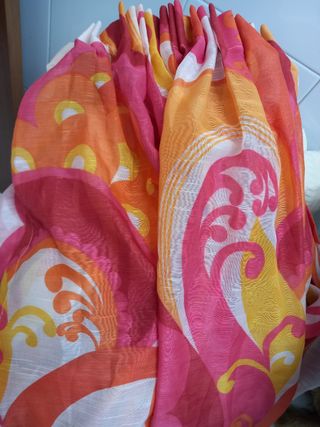 Dos cortinas estampado retro de poliéster. Están en muy buen estado. Tienen puesta la tira para colgar y puedes adaptar el ancho a la abertura que quieras, solo con modificahle los frunces.