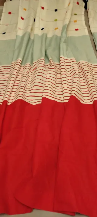 2 cortinas de tela con un diseño de rayas verticales en tonos rosas y naranjas. Medidas aproximadas 240x140 cada una. La parte que da a la luz de la ventana está desgastada, pero la parte que da a la habitación está bien como se ve en las fotos. De ahí su bajo precio.