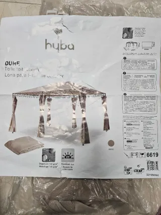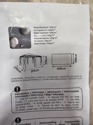 Toldo para techo de cenador modelo DUNE. - Sólo toldo para techo, no cortinas. - Medidas: 395cm x 255cm (alto) x 400cm (largo). - Tejido de poliéster de 160 g/m². - Resistente a los rayos UV.