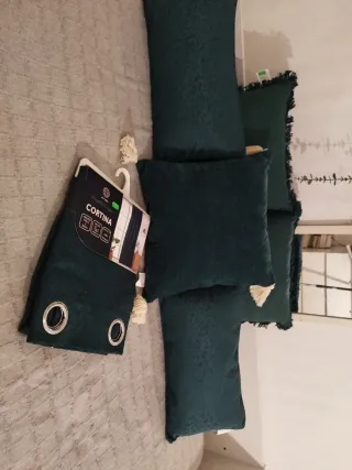 Set de cortina y cojines con un diseño elegante. - Cortina con ojales metálicos. - Cojines con un patrón texturizado. - Incluye dos cojines largos, Dos cuadrados y otro cuadrado. 2 Cojines cuadrados de 43x43 1 cojín cuadrado con flecos 45x45 2 Cojines alargados de 30x50 Cortina 100% Poliéster de 150x260 Valorado todo en 57.80€