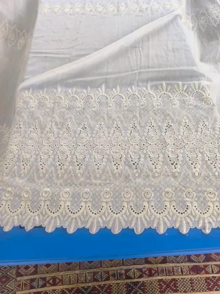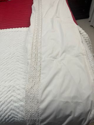 Elegante cortina con un delicado diseño de encaje. Muy ancha, salen dos patas. 2'48 x 2'74 alto. Tengo otro trozo de la misma anchura y 1'83 de largo. - Adorno de encaje en el borde inferior. - Patrón de encaje intrincado en toda la tela.