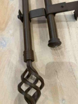 Barra de cortina metálica con un diseño de forja decorativo en uno de sus extremos. Ideal para colgar cortinas en cualquier estancia. - Acabado en color marrón oscuro. - Diseño con espiral decorativa.