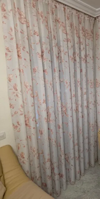 Elegante cortina con un delicado estampado floral, ideal para dar un toque de color y estilo a tu salón. - Diseño floral en tonos rosas y beige. - Confeccionada en tela de alta calidad. - Incluye mecanismo de colocacion (recto y en esquina) y vara de desplazamiento - Medidas del espacio de colocación: ancho 130cm, largo 245cm, fondo (esquina) 23cm No se hace envío. Se vende por traslado/mudanza.