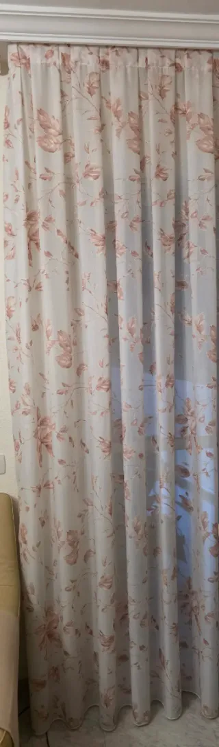 Cortina con un bonito estampado floral. - Diseño delicado en tonos beige y rosa. - Confeccionada en tela de calidad. - Incluye mecanismo de colocación y vara de desplazamiento. - Medidas: largo 245cm (de suelo a techo), ancho 130cm (espacio que cubre) No se hace envío. Se vende por traslado/mudanza