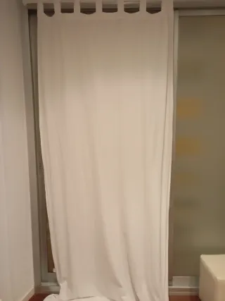 Cortinas de tela en color blanco hechas a medida con 2 abrazaderas. Cada pata mide 148x269. Con cinta pasabarra. La tela tiene un dibujo por lo que tienen marras.