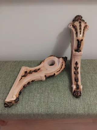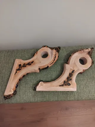 Conjunto de dos soportes de marmolina decorativos para barra de cortinas con un diseño elegante. Antiguos - Acabado en beige con detalles en negro. - Diseño floral y ornamental.