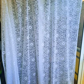 Vendo cortina de dormitorio de una pieza, de 2,20x4,80 metros, blanca calada, acabado en encaje, con cenefa ondeada en la orilla inferior, confeccionada con cincha ancha, pliegues y enganches de plástico. Regalo dos rieles de metal blanco lacado, más cordón y tiradores.