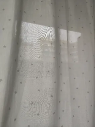 Cortina infantil con estrellitas grises y barra de madera con dos estrellas de tope. Medidas aprox 118*242cm